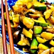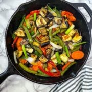 This spicy eggplant stir fry is so easy to make and is a delicious vegan dinner! The sweet and spicy sauce and fresh veggies makes this recipe a winner.