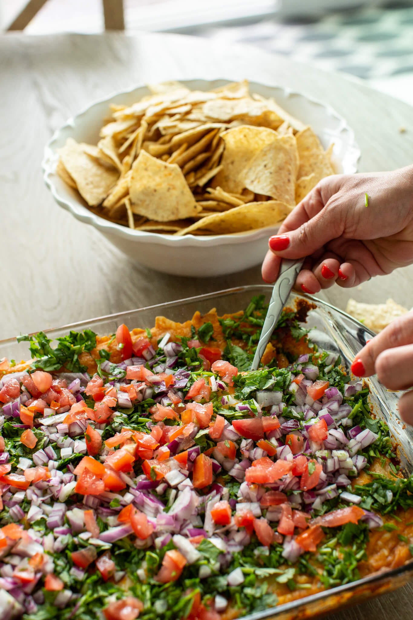 - Garnish with scallions, cilantro and other optional toppings before serving with tortilla chips.