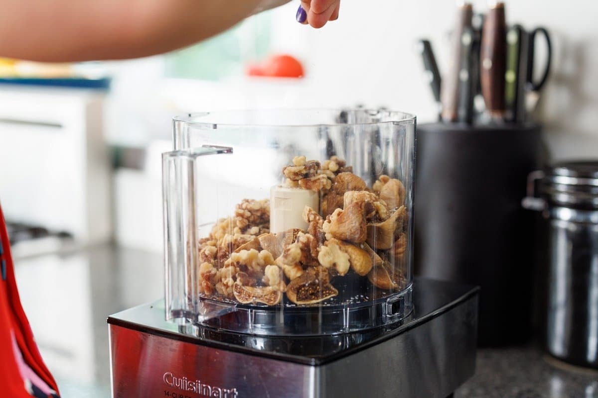 - Place all ingredients in a large food processor and pulse until finely chopped, almost the consistency of sand. This may take 4-5 minutes. Remove blade and put aside.3 cups dried figs, 1 cup walnuts halves, 1/4 cup flax seed meal, 1 tablespoon pure vanilla extract, 1/2 teaspoon salt