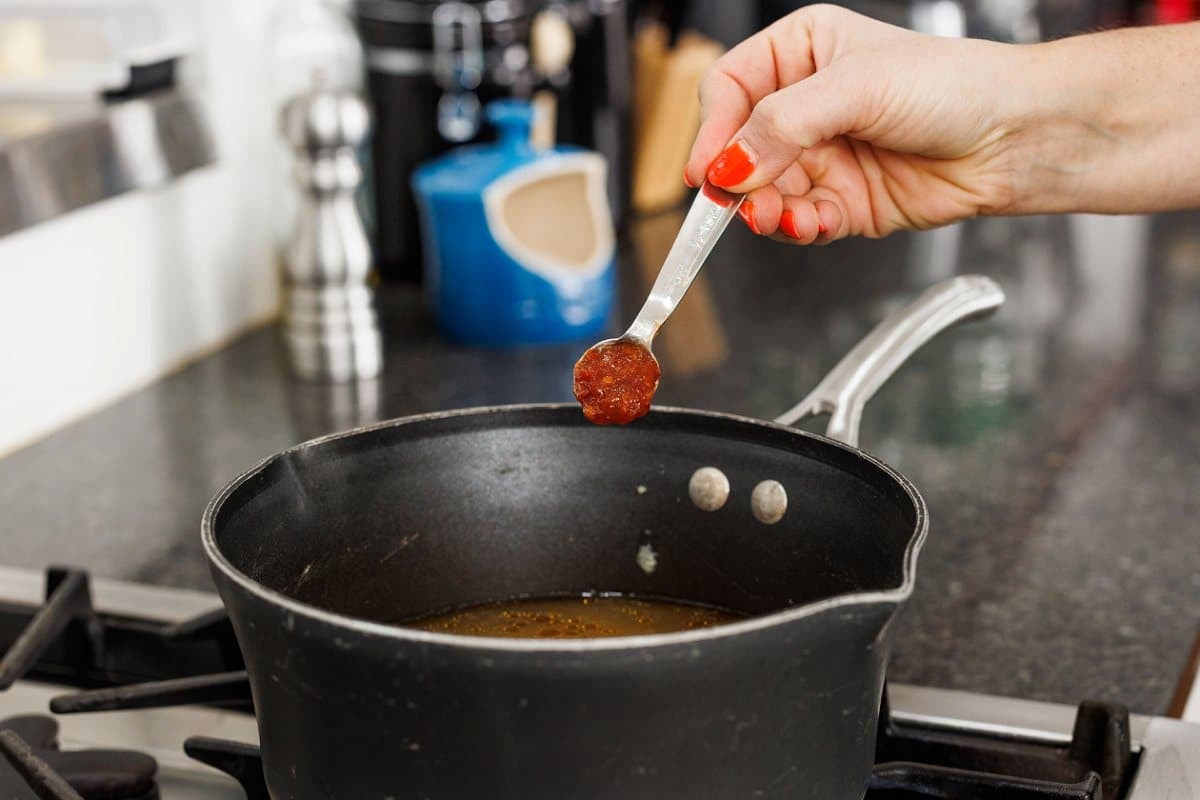 And add the chili paste and ginger. Bring to a boil, whisking occasionally to mix all the liquids together.