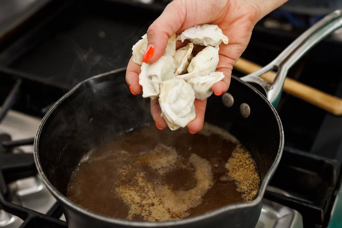 - Add frozen dumplings, mushrooms, and baby spinach to the boiling broth and simmer for 3 minutes until dumplings are warmed through and kale is wilted.