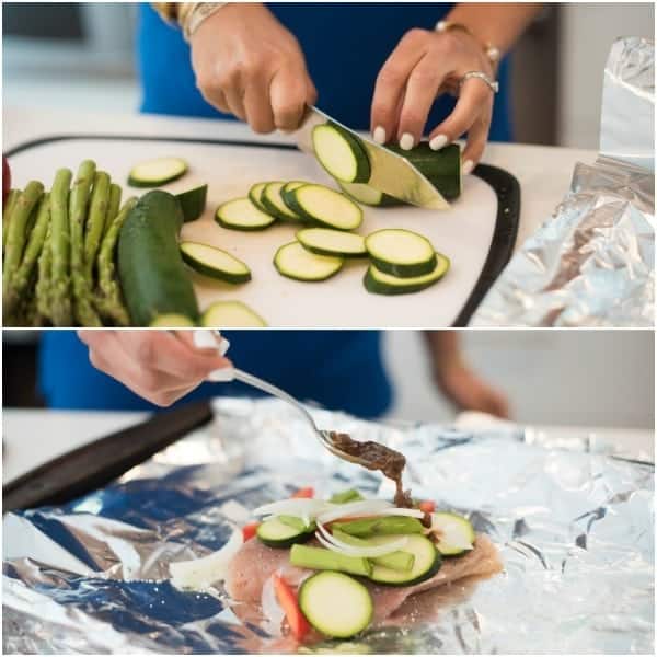 - Top each piece of foil with chicken and sprinkle evenly with salt and pepper. Place 1/2 cup of sliced veggies on top of each piece of chicken; set aside.