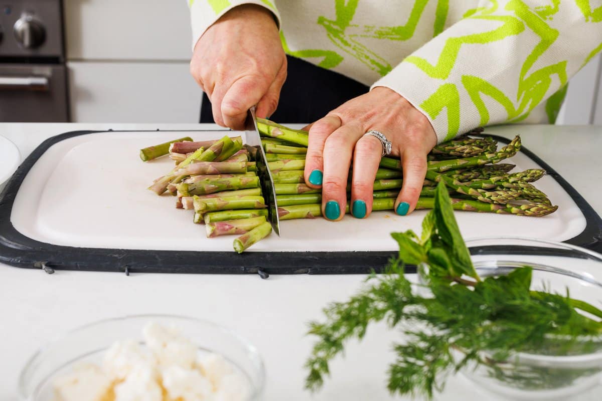 Start your asparagus salad with green beans by trimming the stalks of your asparagus.