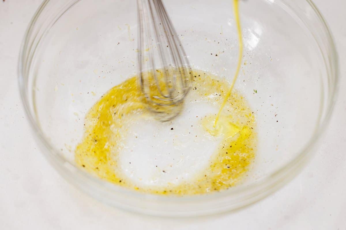 To make your dressing, add the olive oil and fresh lemon juice to a large bowl. Whisk together with the garlic, fresh herbs, and some salt and pepper.