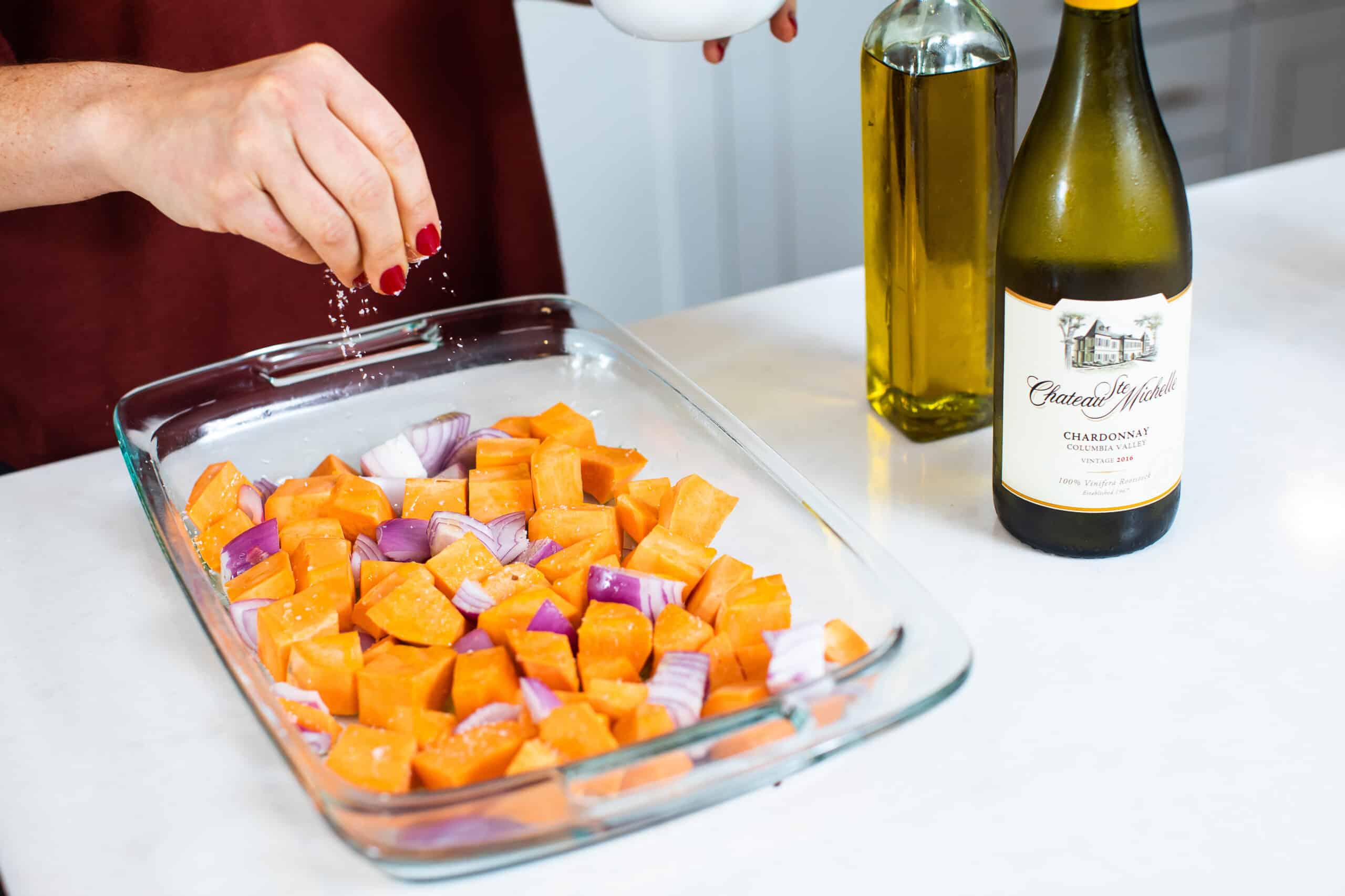- Scatter sweet potatoes, garlic, and onion in the bottom of a large baking dish. Drizzle with olive oil and season with salt and pepper. Toss well.4 cups sweet potatoes, 1 red onion, 6 cloves garlic, 1 tablespoon extra virgin olive oil