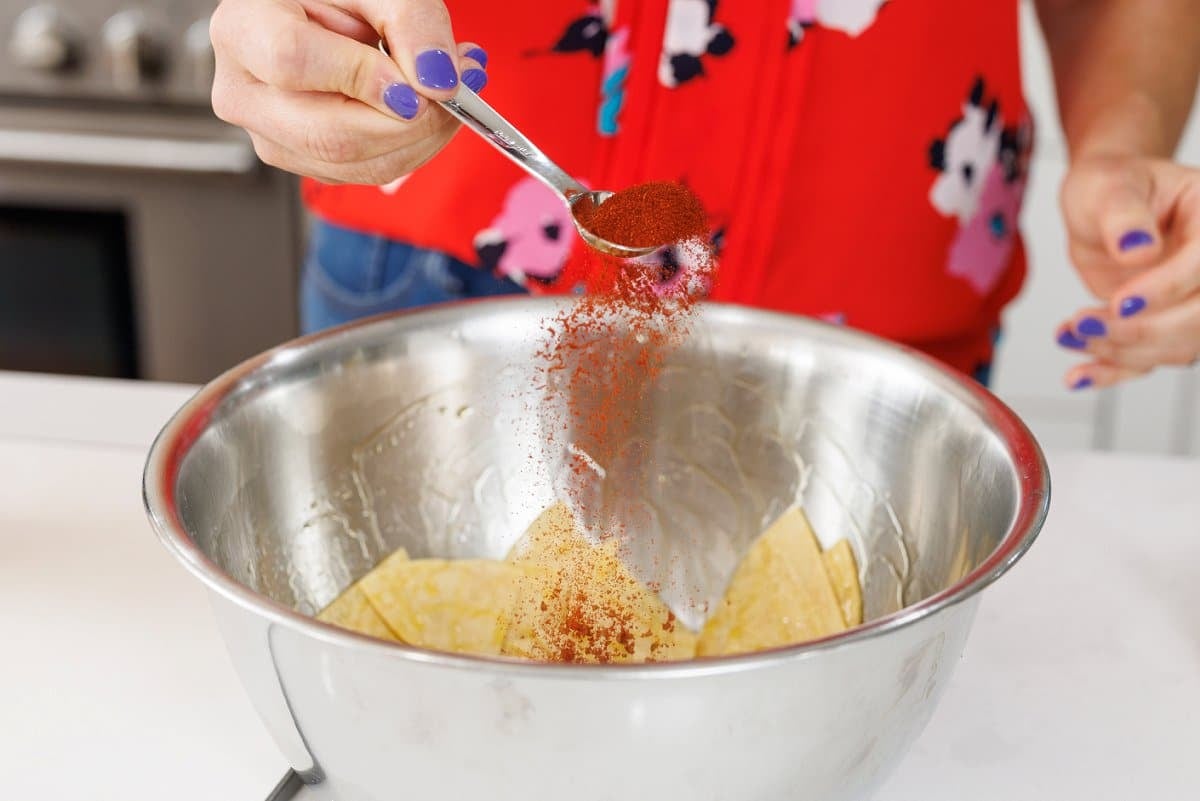 - Drizzle olive oil and spices over tortilla triangles and mix well so all tortillas are evenly coated in oil and spices. Don’t be afraid to use your hands!2 tablespoons extra virgin olive oil, 1 tablespoon cumin, 1 tablespoon smoked paprika, 1 teaspoon salt, 1/2 teaspoon pepper
