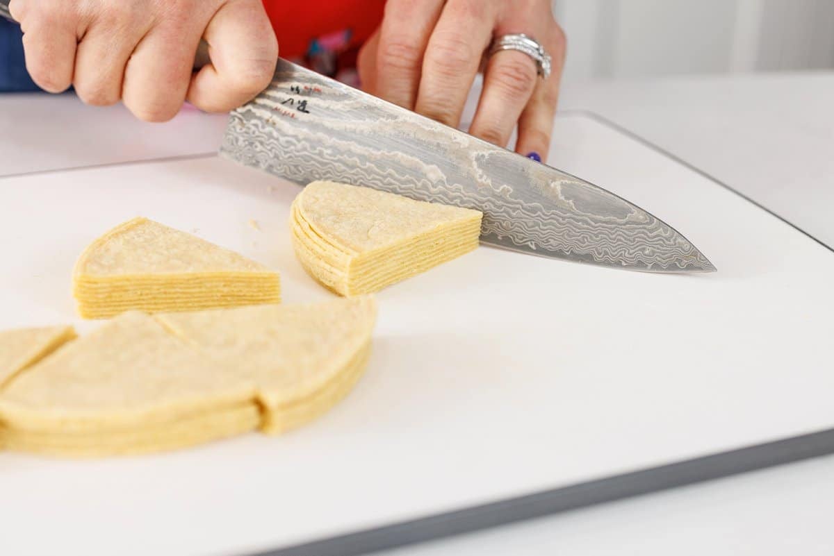 Start your baked corn tortilla chips by cutting your tortillas into triangles. I find it’s quickest if you stack the tortillas and use a very sharp knife or pizza cutter.