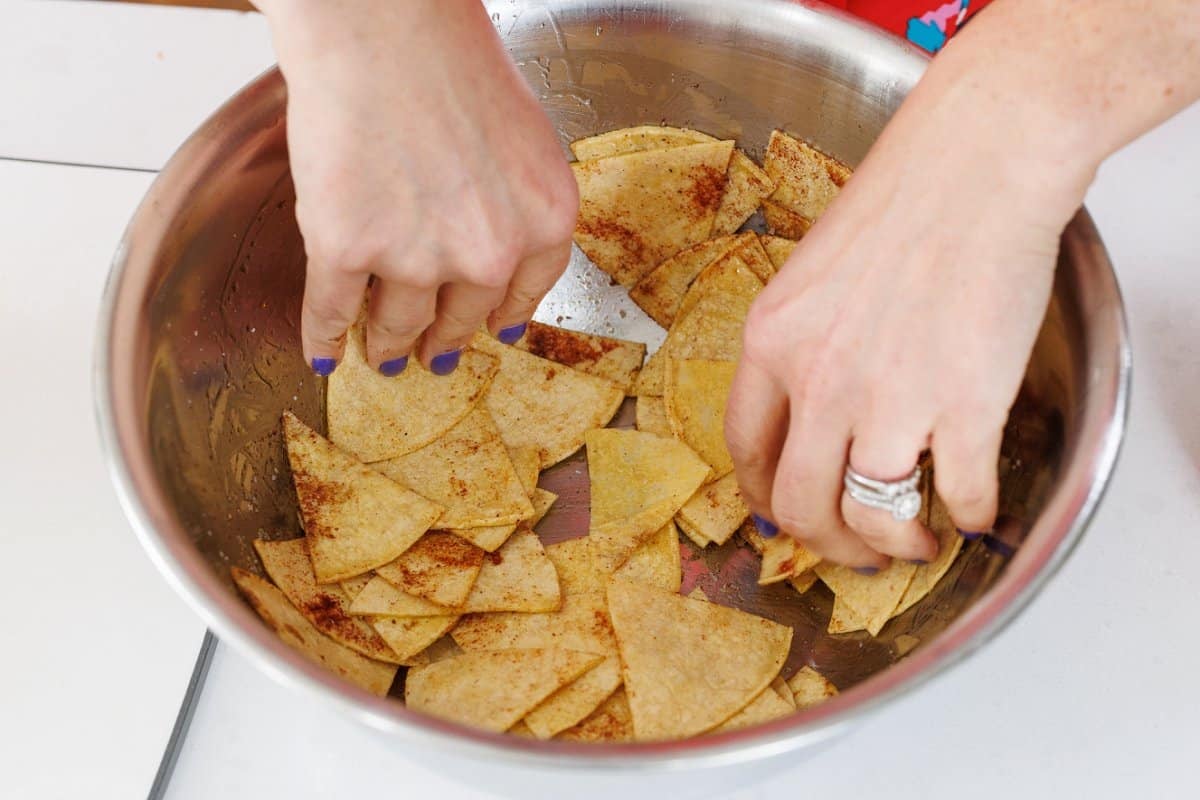 Then toss those tortilla triangles well, making sure that they are evenly coated with the oil and spices. Don’t be afraid to use your hands!
