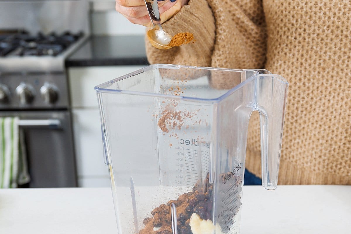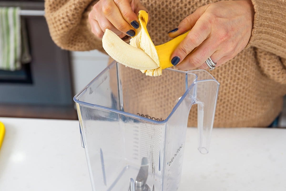 Then peel and add the banana to your blender. If you don’t want to use as much ice, try using a frozen banana.