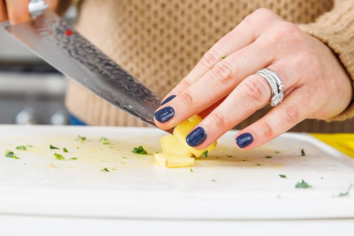 Start our banana berry kale smoothie by chopping your kale and slicing your ginger into thin slices.