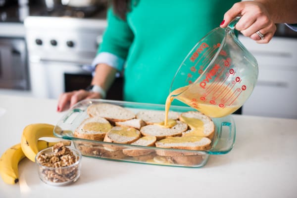 - Top egg-soaked bread layer with half of the banana slices and 1/2 cup of the chopped walnuts. Place the remaining bread slices on top then pour over the remaining egg mixture, making sure each slice is fully soaked. Sprinkle on remaining banana slices and chopped walnuts before covering baking dish with the Red Lid. Refrigerate for overnight (or at least 2 hours.)