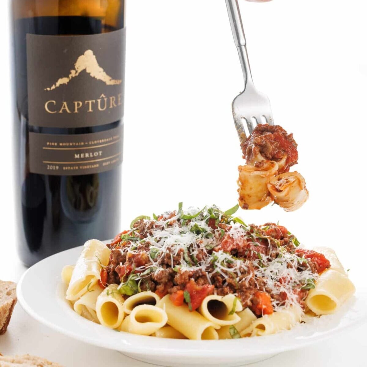 Cozy up with family and friends and enjoy this delicious Beef Bolognese. Be sure to pour yourself a glass of Captûre Merlot along with it.