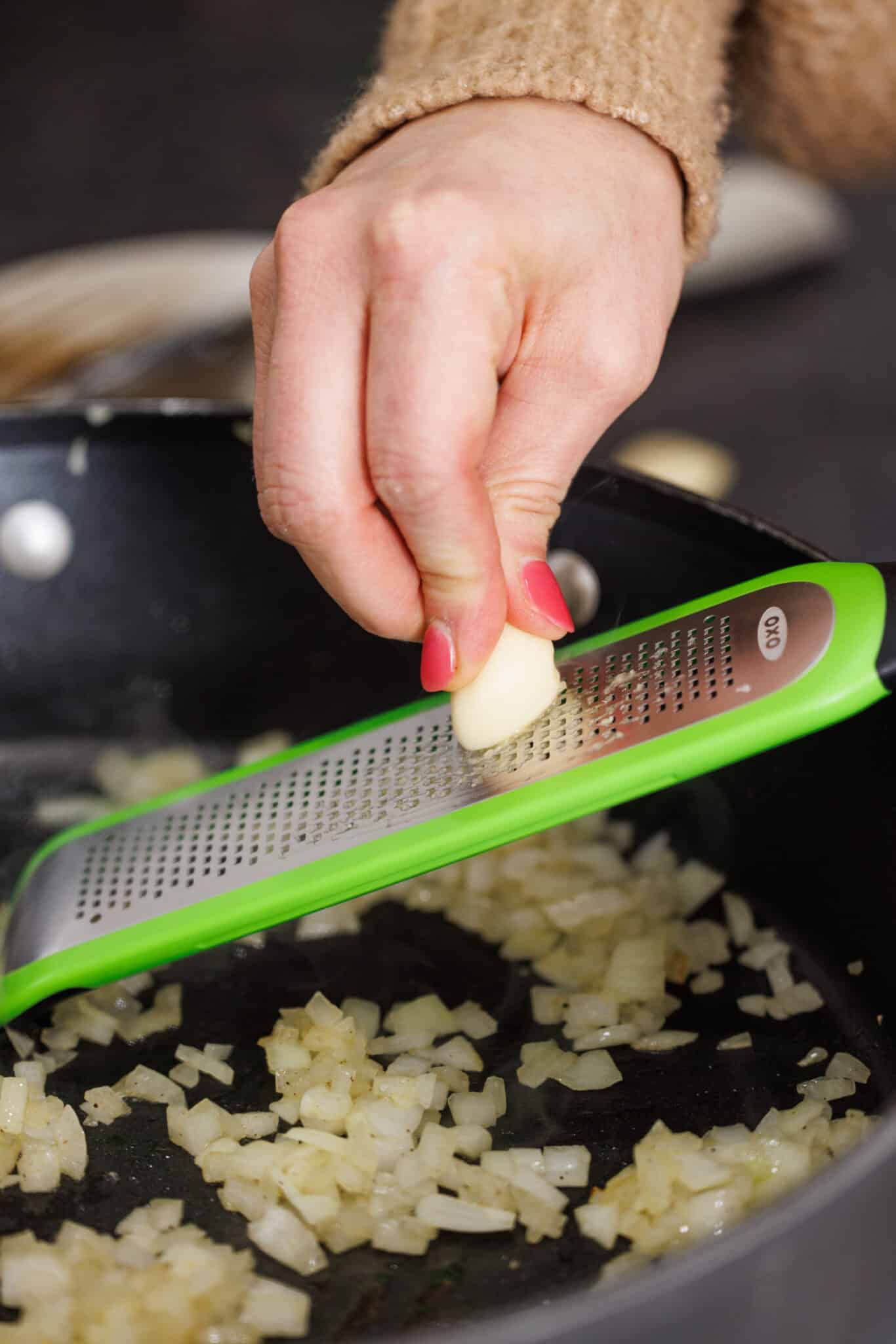 Use a microplane to grate in your garlic, and sauté until veggies are soft and caramelized.
