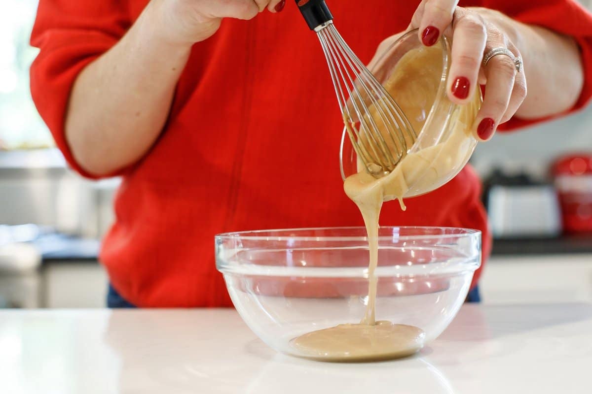 - Prepare peanut dipping sauce by whisking together all ingredients in a small bowl. Slowly add in warm tap water, about a tablespoon at a time, until you reach desired consistency. Reserve for later.