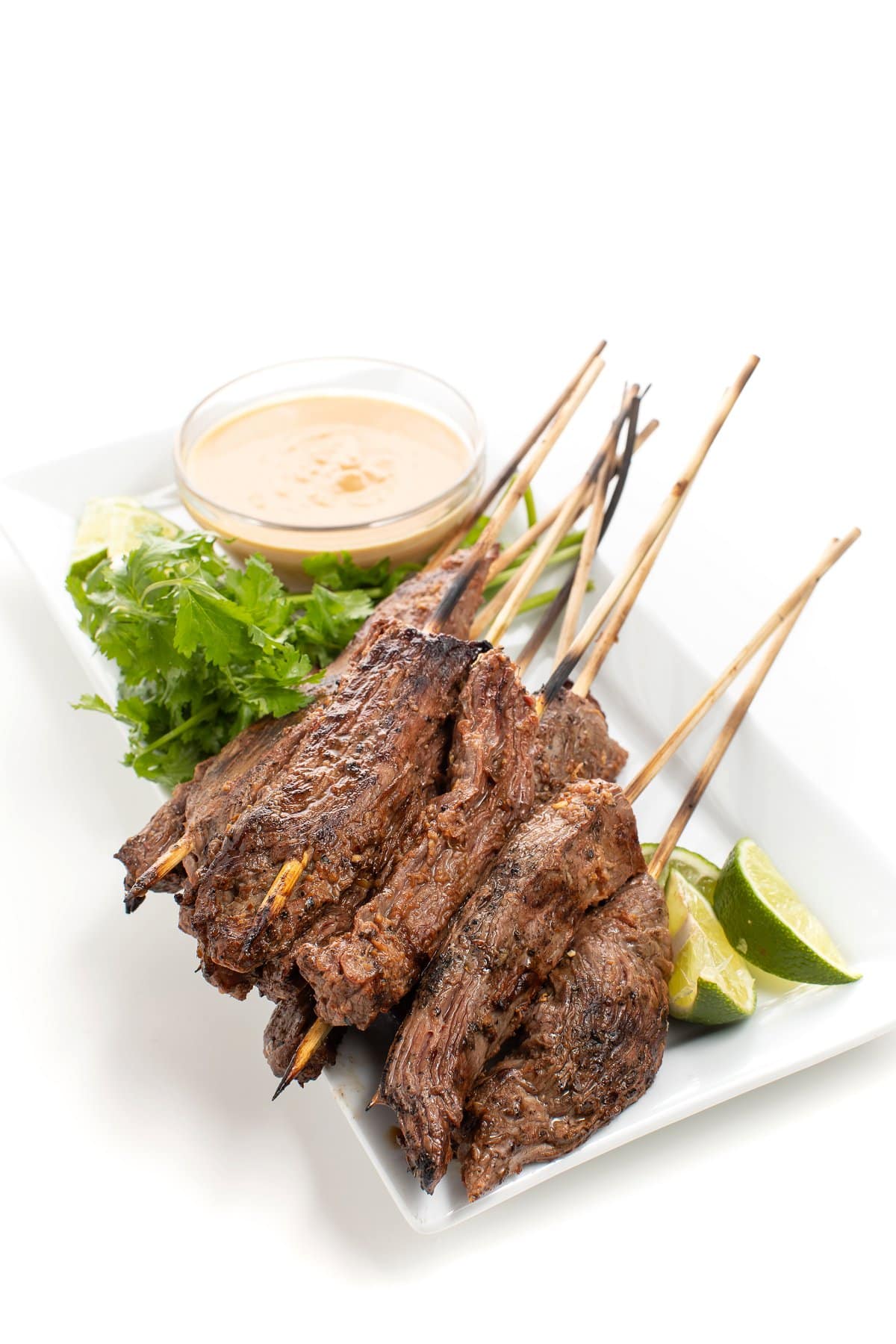 These mouth-watering Thai beef satay skewers with peanut dipping sauce are tangy, tender, and perfectly balanced with a cool and creamy dipping sauce.