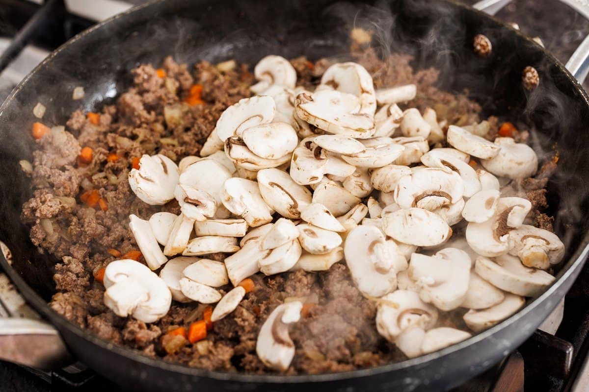 Once the bison is mostly browned, add the sliced mushrooms along with the spices (oregano, thyme, Worcestershire sauce, mustard, and chili flakes).