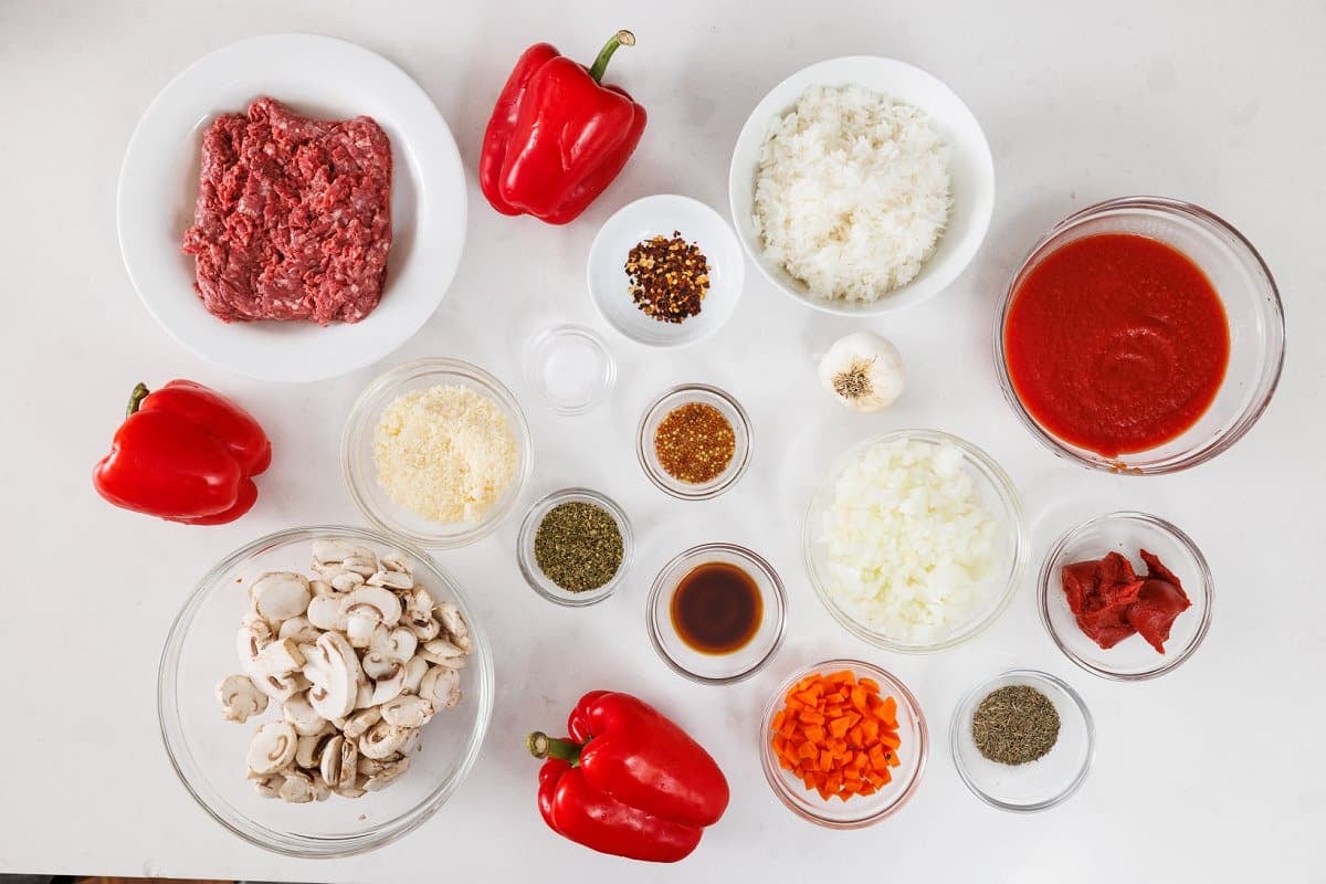 Anyway, my husband recently requested stuffed peppers so I decided to create a meaty, protein-packed stuffing. We had ground bison on hand (my newest obsession), some leftover cooked rice, and mushrooms. If you’ve never tried ground bison, it tastes just like ground beef (much more so than ground turkey), but it has fewer calories and less saturated fat and cholesterol per serving. Bison can also be used in my Stuffed Peppers with Beef and Bulgur, Pizza Stuffed Peppers or stuffed pepper soup.