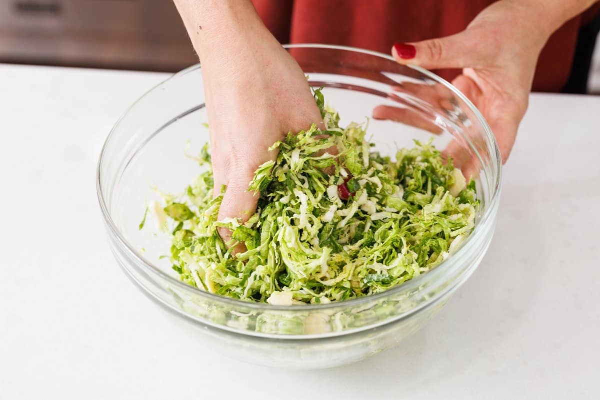 - Zest the lemon directly over the bowl. Next, drizzle the shaved Brussels with olive oil, lemon juice, garlic, salt and pepper. Toss well, ideally using hands, to slightly "massage" the vinaigrette into the Brussels.