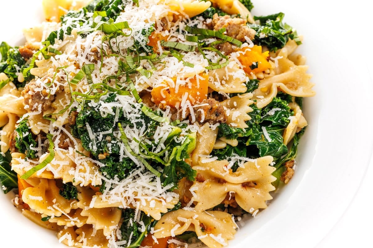 Butternut squash and sausage pasta is cooked with garlic and olive oil, while being tossed with wilted kale and nutty parmesan cheese.