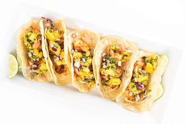 - When you’re ready to serve, heat remaining oil in a medium skillet and lightly pan-fry tortillas, about 90 seconds per side, to soften. Serve shrimp tacos with warm tortillas and top with mango salsa.