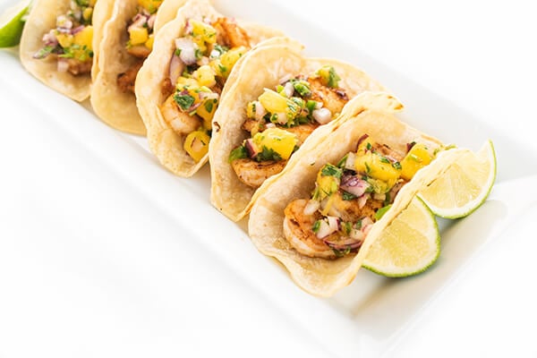 A quick and easy 15-minute dinner recipe, these Caribbean spiced shrimp tacos are topped with a sweet and spicy mango jalapeño salsa.
