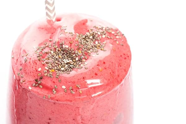 Before serving, I sprinkle each glass with chia seeds to add a crunchy texture to each sip. You’re welcome to blend them in with the rest of the ingredients as well.