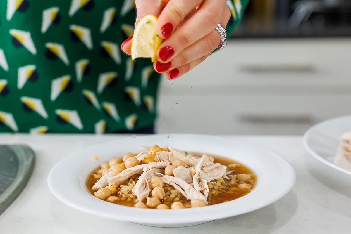 Add your lemon juice. Alternatively, you can warm the shredded chicken, chickpeas, and lemon juice all together in the bone broth and scoop all at once over the bulgur wheat.