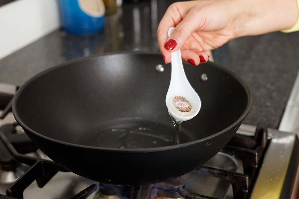 - Pre-heat a wok or deep frying pan over high heat and spray with cooking spray.