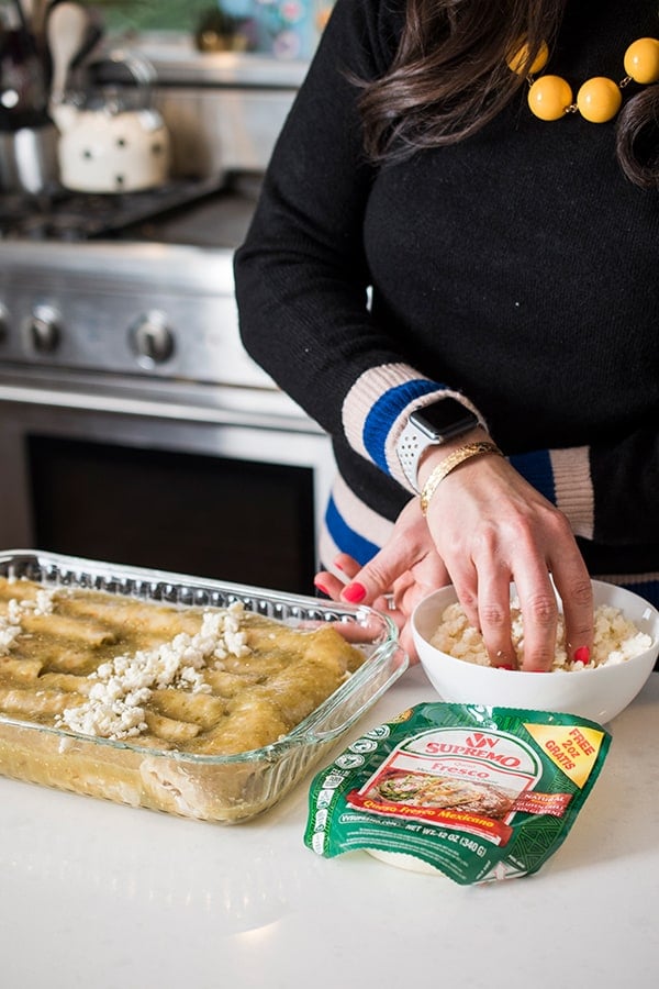 What surprised me most was that the enchiladas are topped with just salsa verde and a light sprinkling of queso fresco before going into the oven. My queso fresco of choice is always V&V Supremo because their cheese is authentically made in the hand-crafted style of Central Mexico with pasteurized, grade “A” whole milk cows from Midwestern farms, and no added artificial hormones.