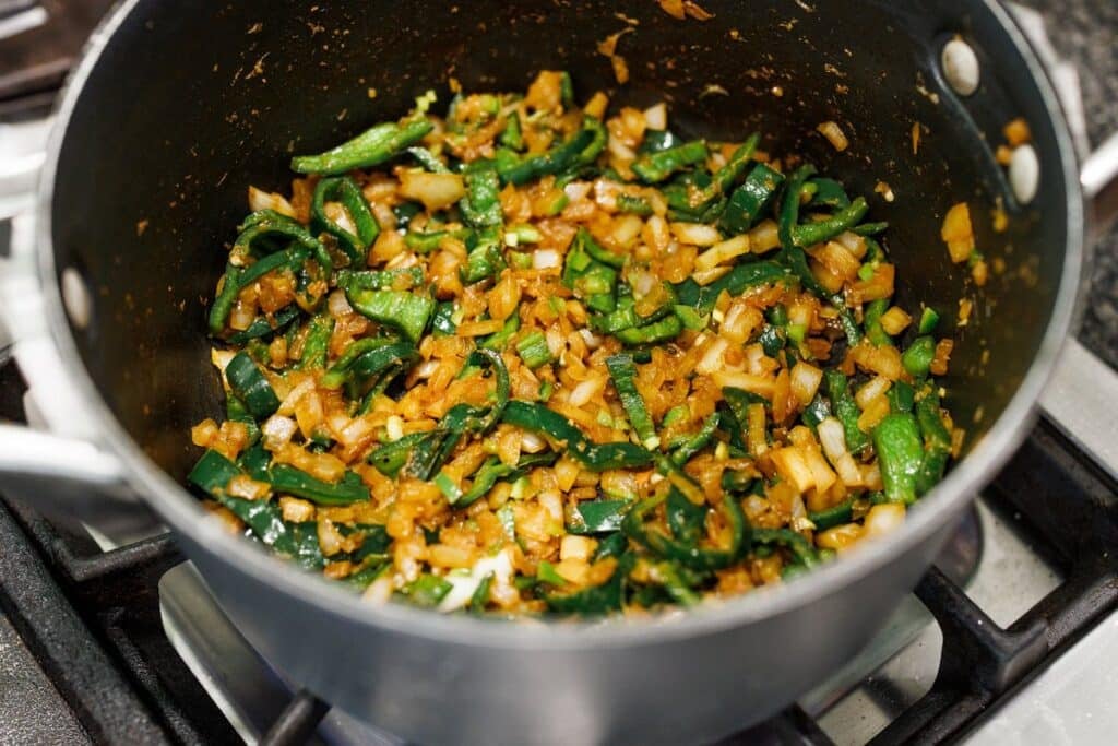 Step 7. Add the poblano peppers and continue cooking until all softened and caramelized. Then add the chicken back to the pot.
