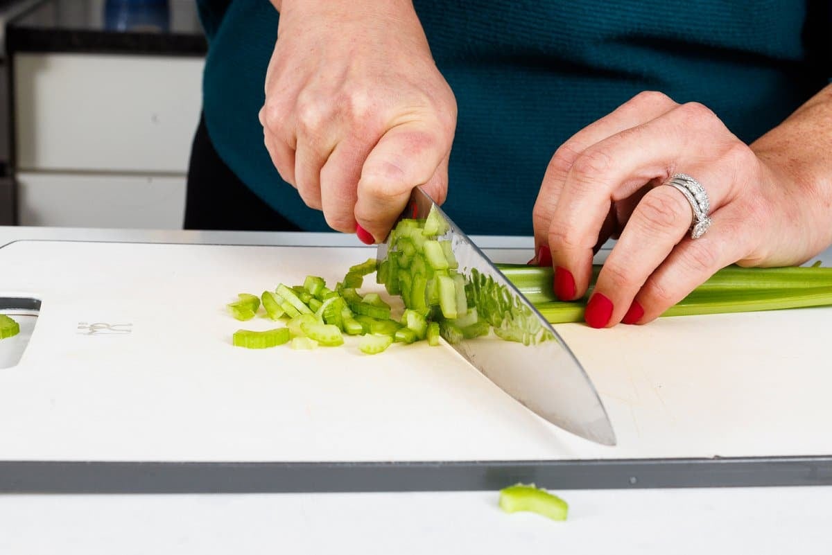 Start your chicken salad sliders by dicing your celery and onion.