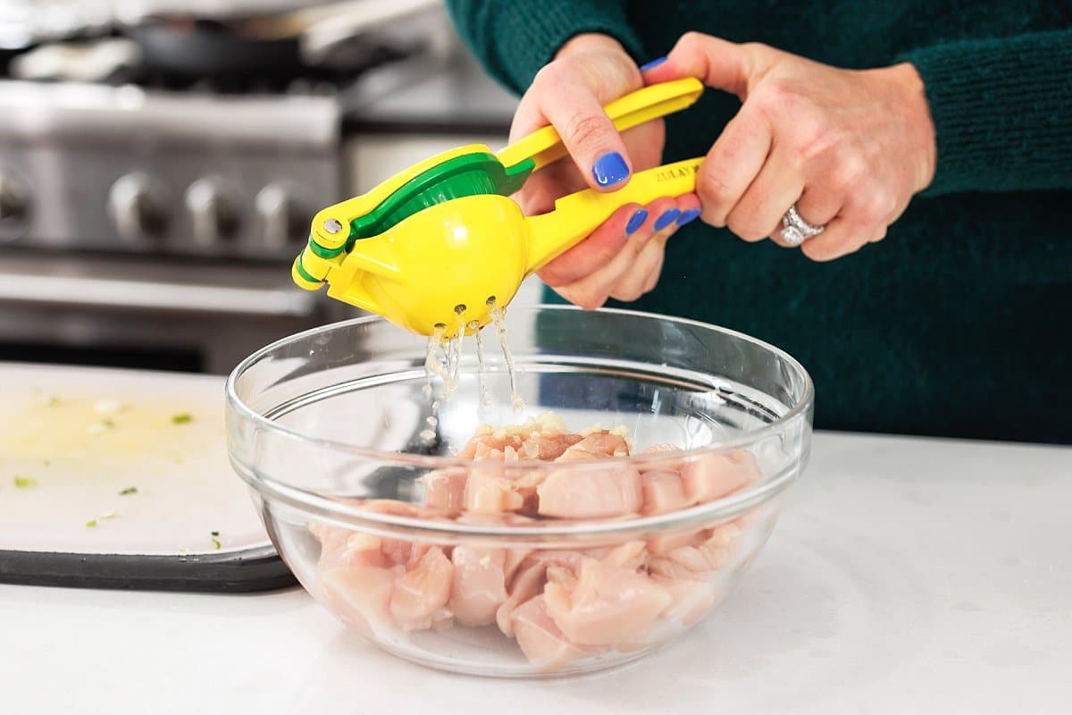 - Begin by marinading the chicken: in a medium bowl, whisk together lemon juice, olive oil, garlic, salt and pepper. Add chicken cubes to the bowl and toss well. Marinate for 20 minutes.