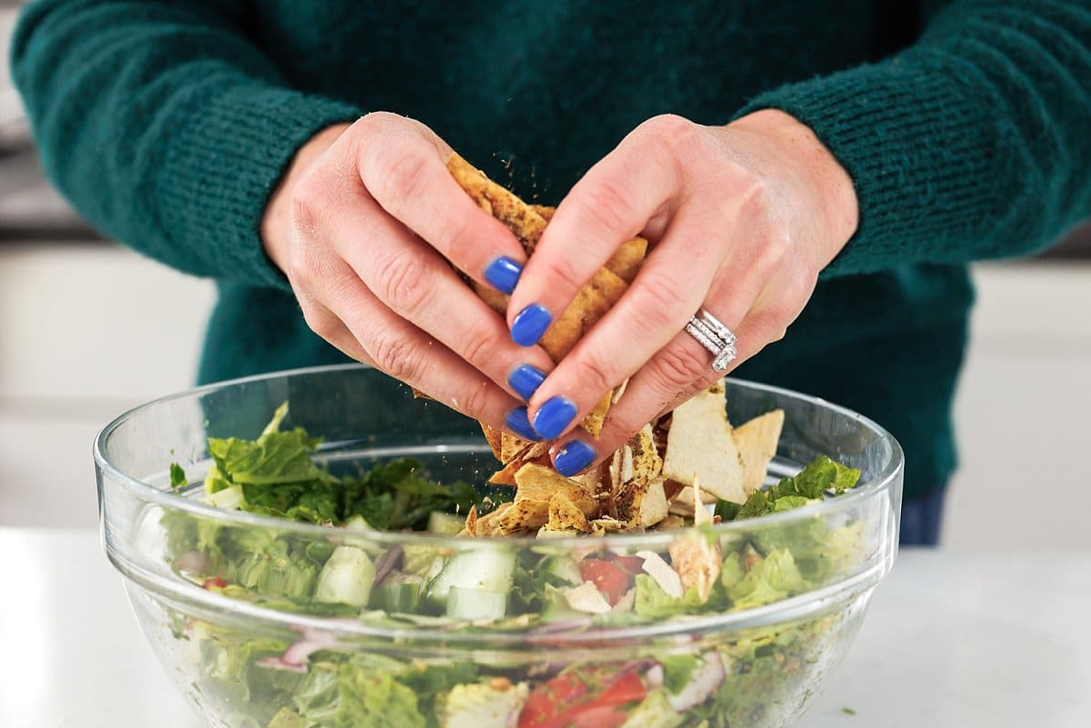Then break up the pita chips to top the salad as well.