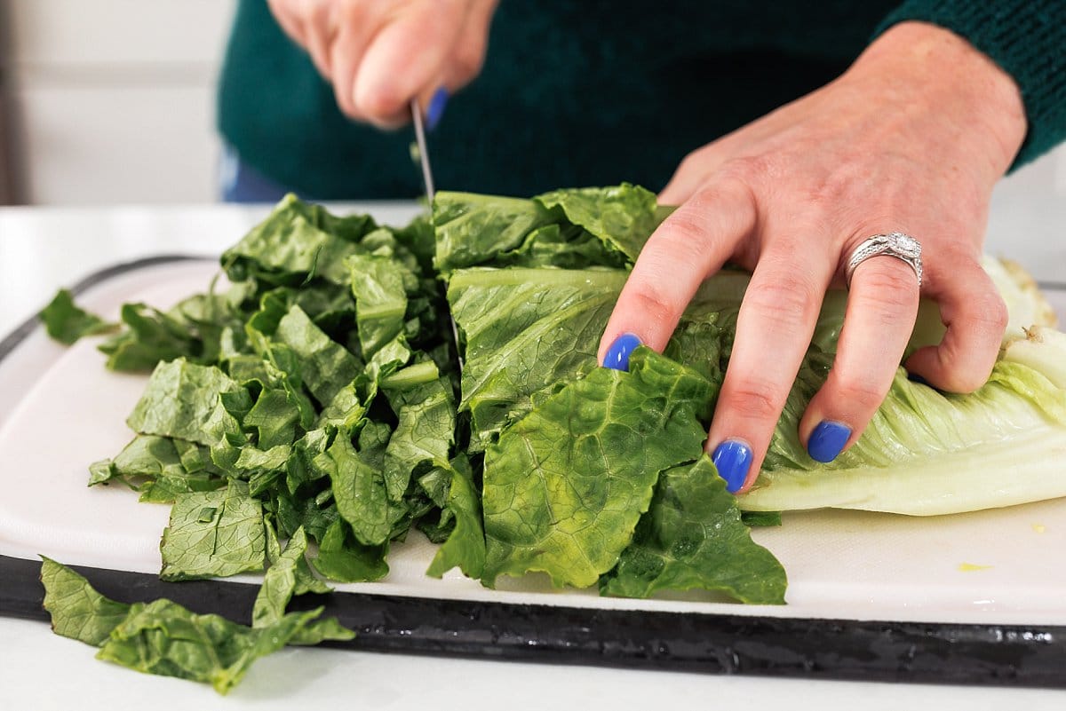 Next, prepare your salad by chopping the lettuce, parsley, tomato, cucumber, and onion.