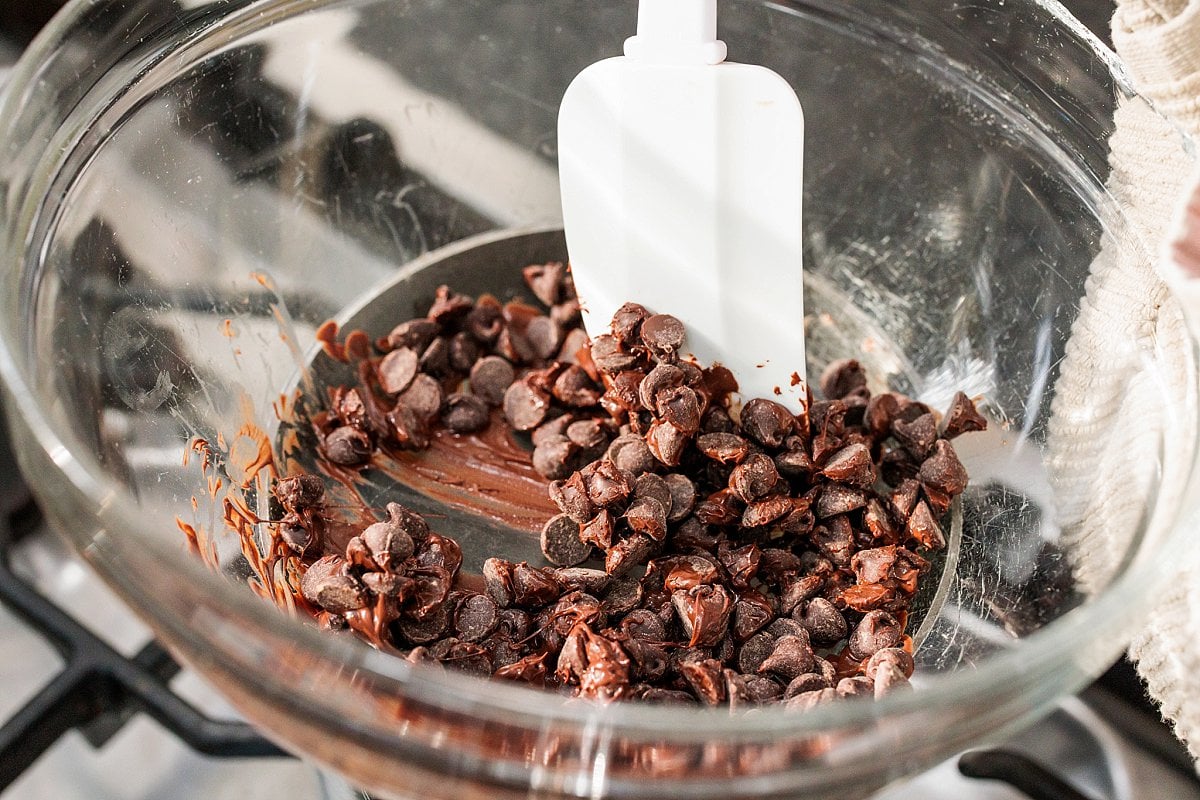 - Melt the chocolate chips over a double boiler by simply heating them in a heat-proof bowl placed on top of a small pan with simmering hot water. Stir continuously with a rubber spatula until chocolate chips have completely melted being careful not to let the chocolate burn. Remove bowl of melted chocolate from the heat.