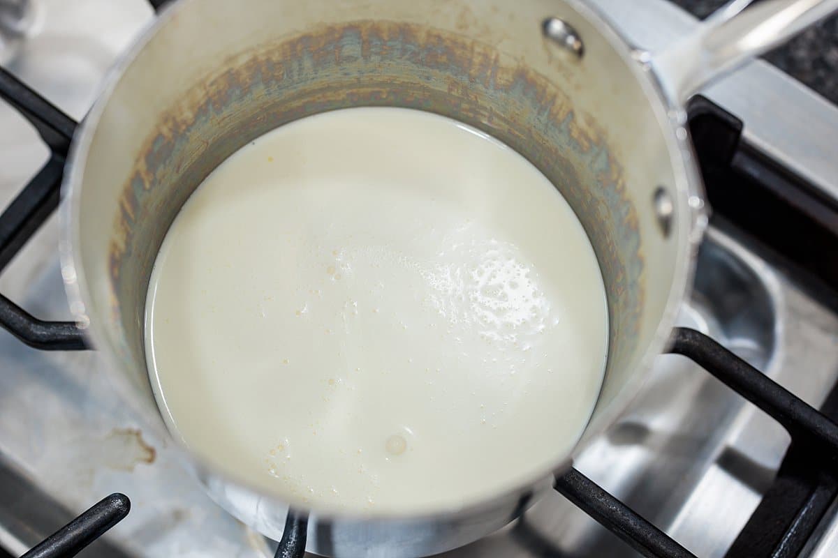 - Heat heavy cream in a small pan over low heat, slowly bringing to a boil.