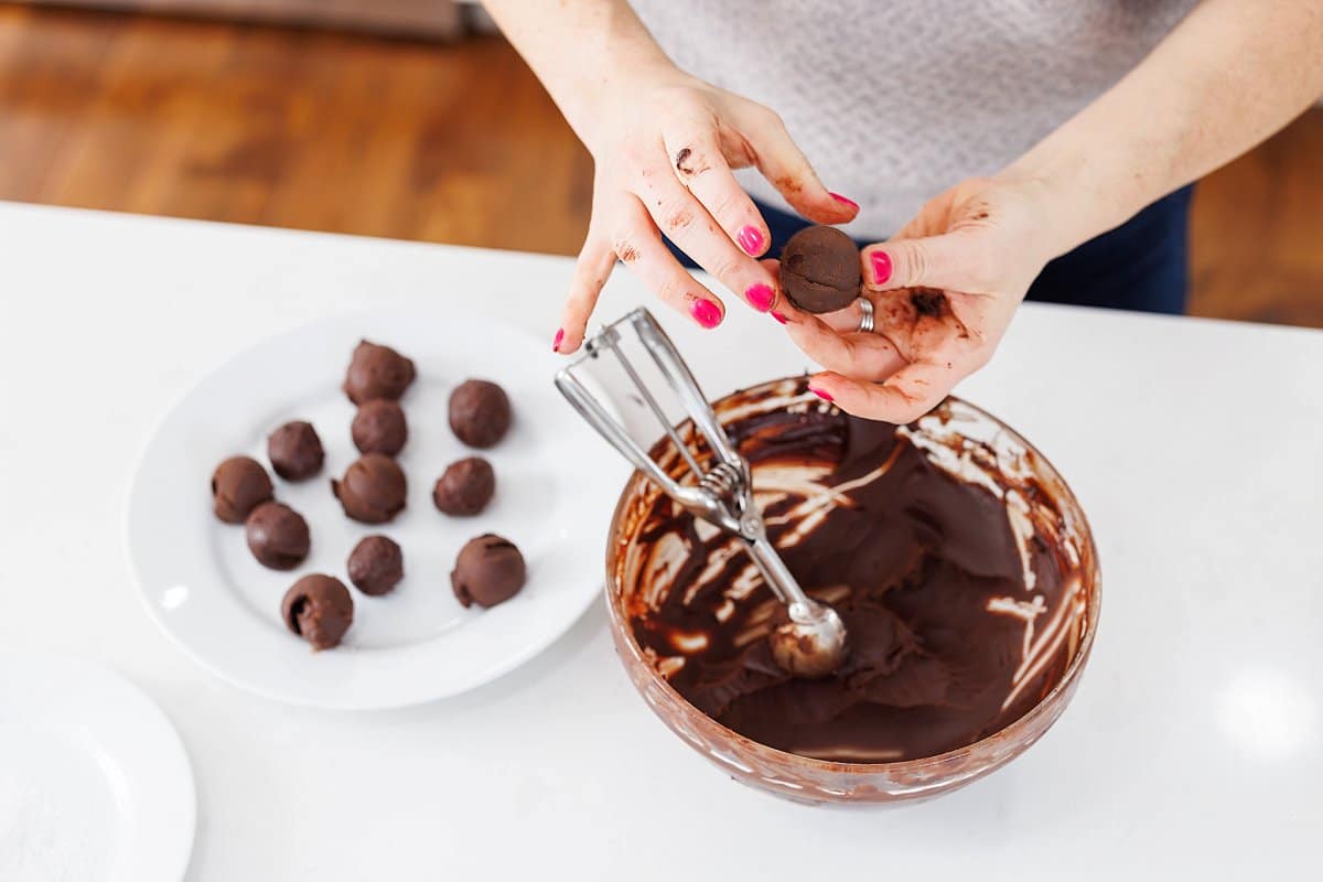 Remove from fridge, and using two spoons or a small cookie scoop, form chocolate into round truffles. Place on a plate or a cookie sheet lined with parchment paper.