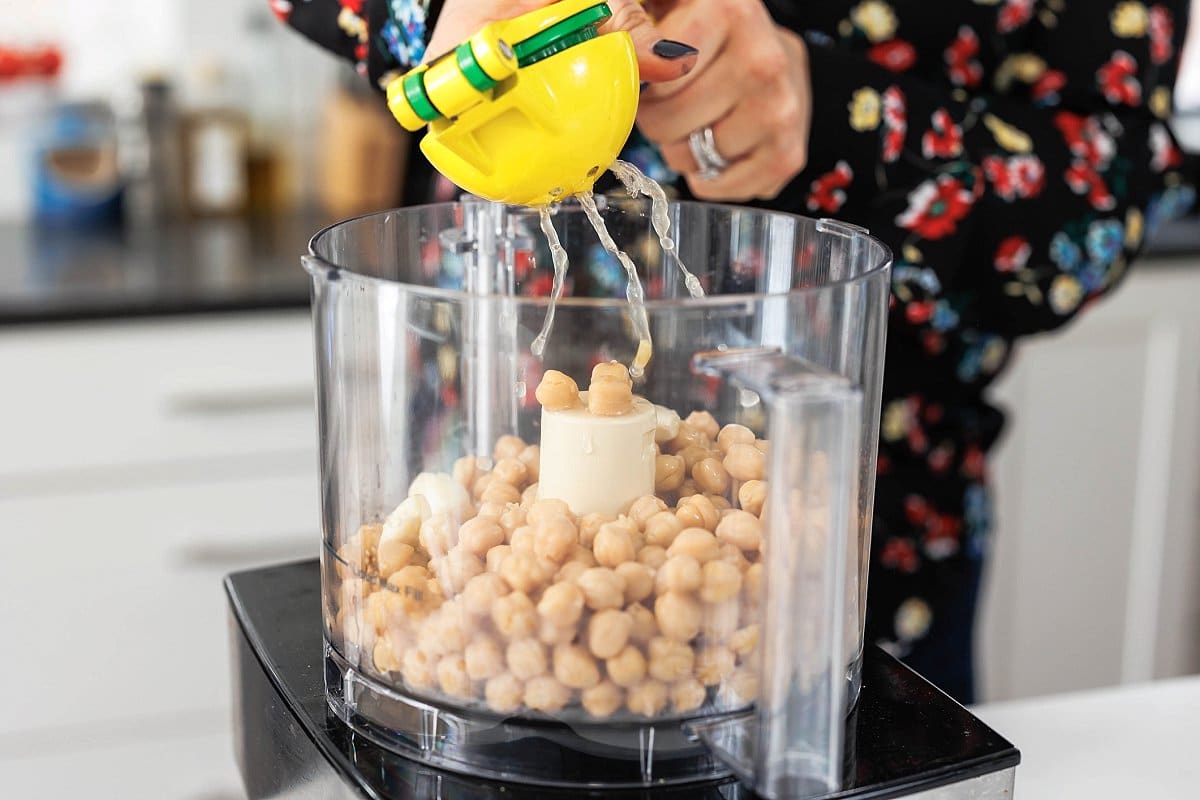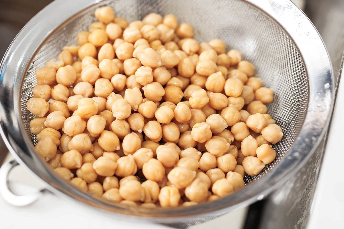 Start your Lebanese Hummus with Toasted Pine Nuts by draining and rinsing your chickpeas.