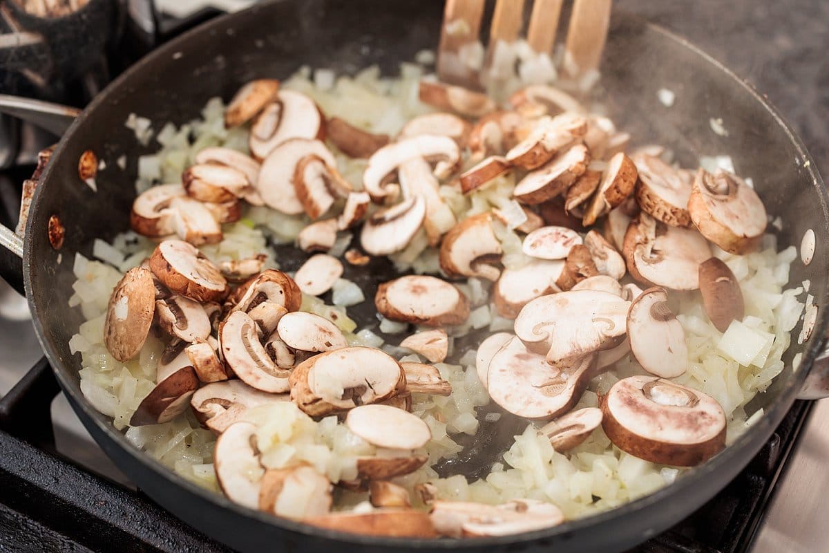 - Saute onions and mushrooms for 5-7 minutes adding salt and pepper to release juices.