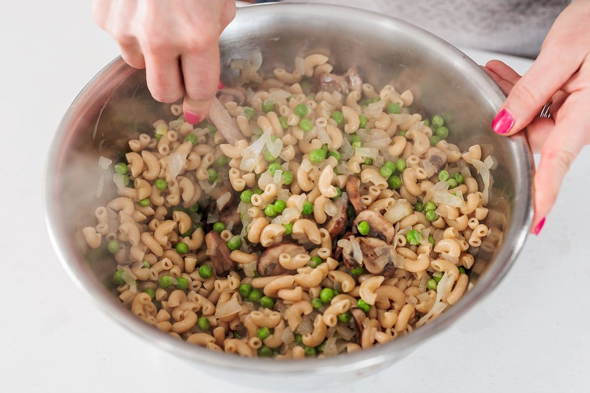 Once the mushrooms and onions have browned and softened, stir in the frozen peas and cook until warm. Remove from the pan and add to a large bowl.