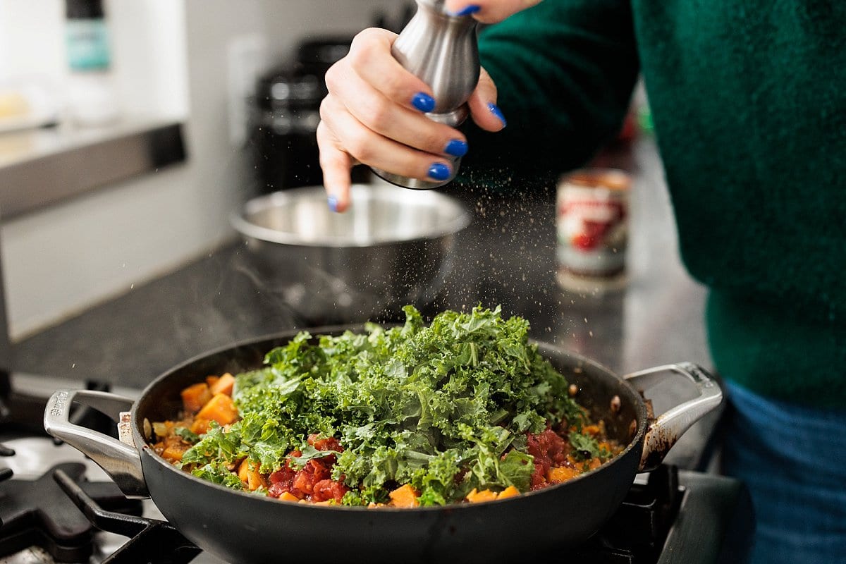 - Stir in tomatoes, salt, pepper and kale and cook for additional 20 minutes. Add more broth if needed.