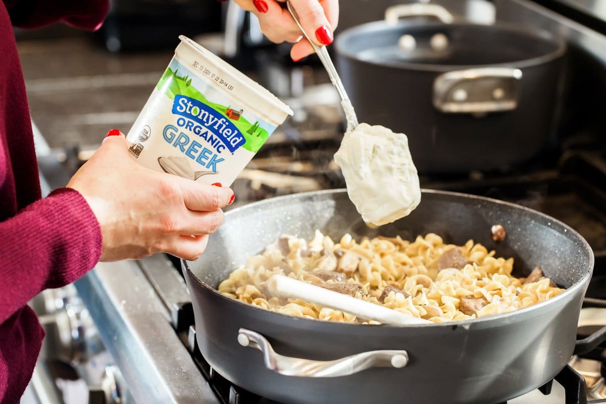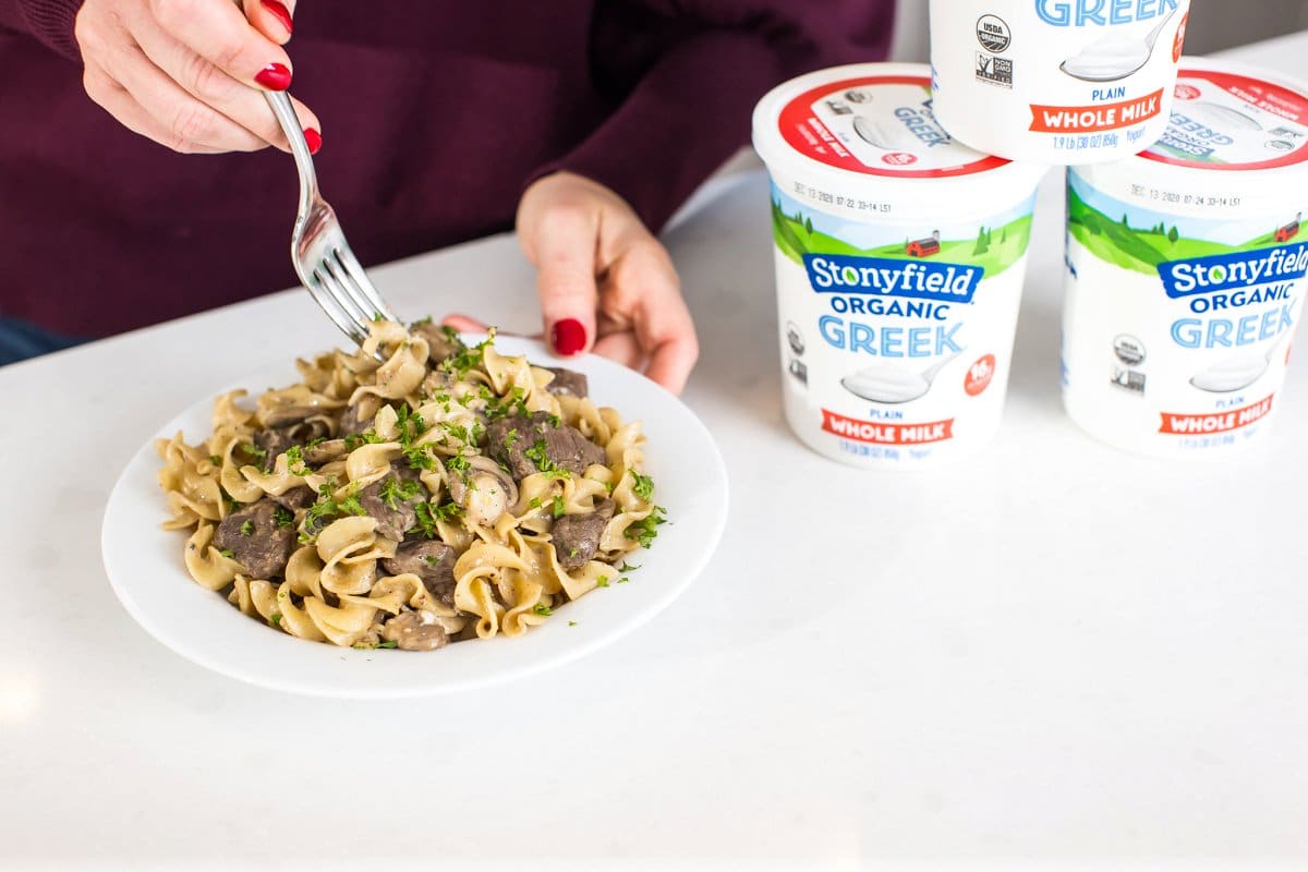 Recently I partnered with my good friends at Stonyfield Organic to create a protein-packed Beef Stroganoff made with their creamy, full-fat whole milk Greek yogurt. Traditionally made with sour cream, I prefer using Stonyfield Organic Greek yogurt which contains more protein and fewer calories. Yogurt is one of those highly versatile products that I love to keep on hand for all sorts of surprising and unexpecting recipes such as this one.