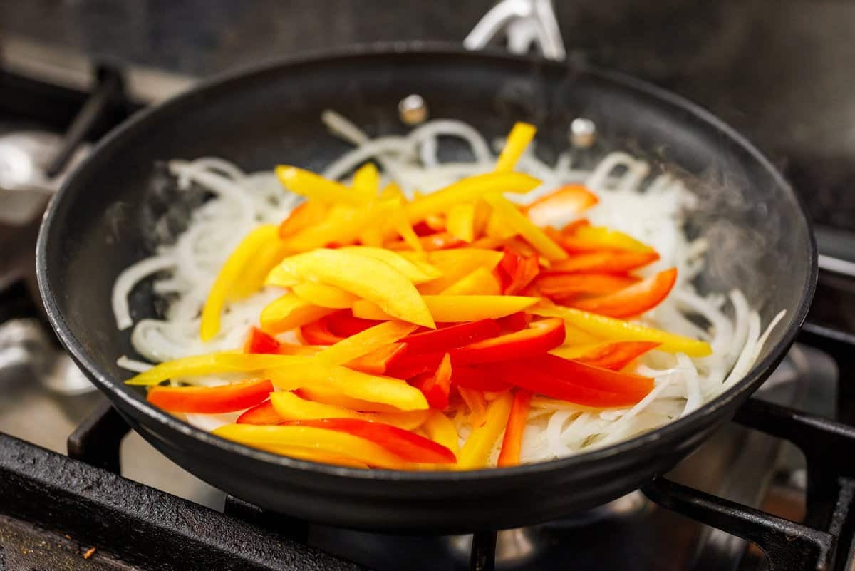 Add your slices of onion and bell pepper to the hot pan.