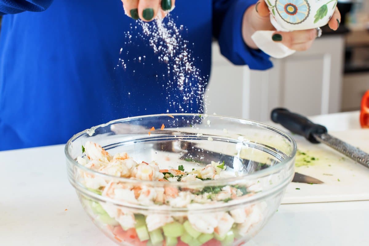 - Cut the cooked shrimp into small, bite-sized chunks. Toss in a bowl with all remaining ingredients. Add salt and pepper to taste before serving.