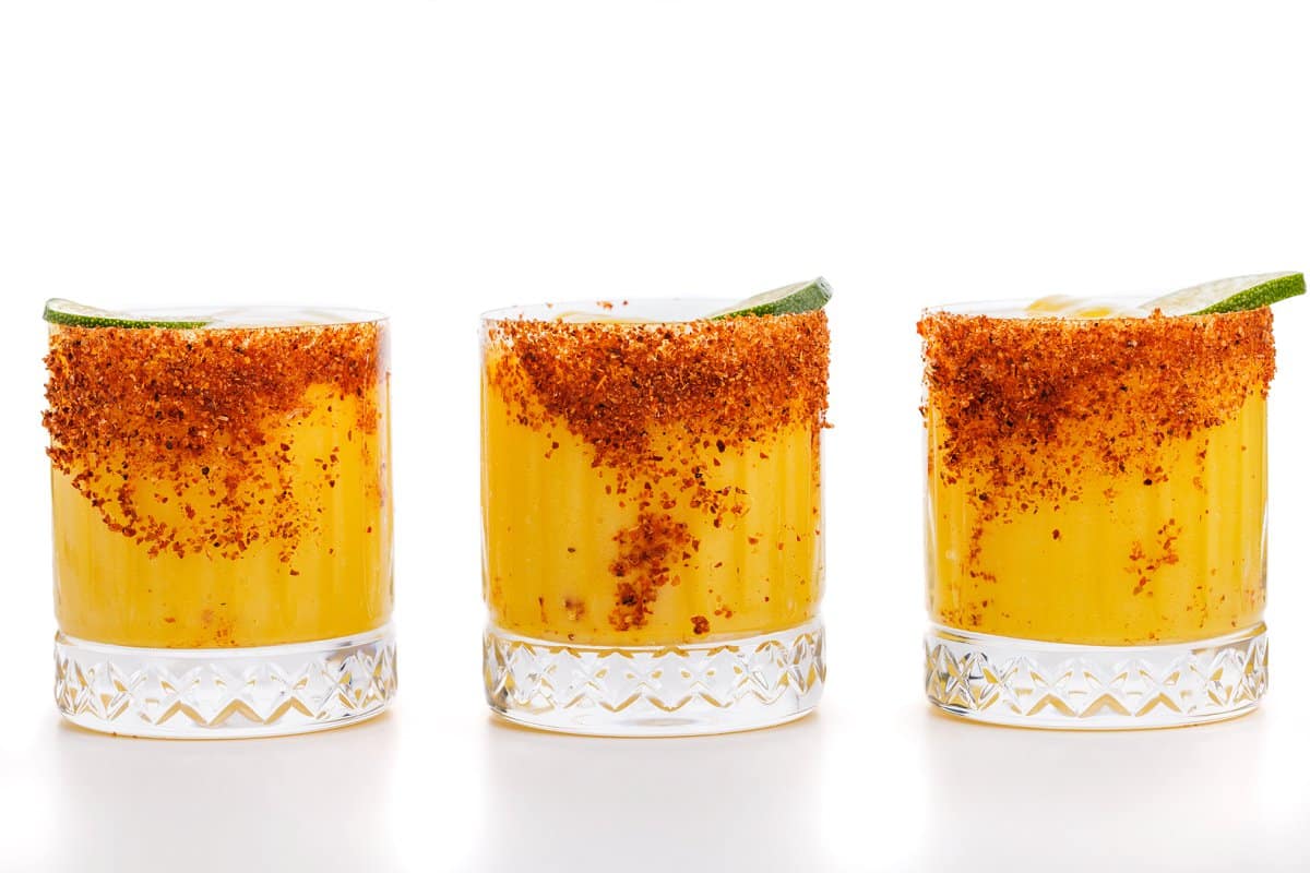 Sweet and tangy frozen mango margaritas are served with a chili-lime salt-rimmed glass for a spicy kick. Every sip is sweet, sour, spicy and salty!