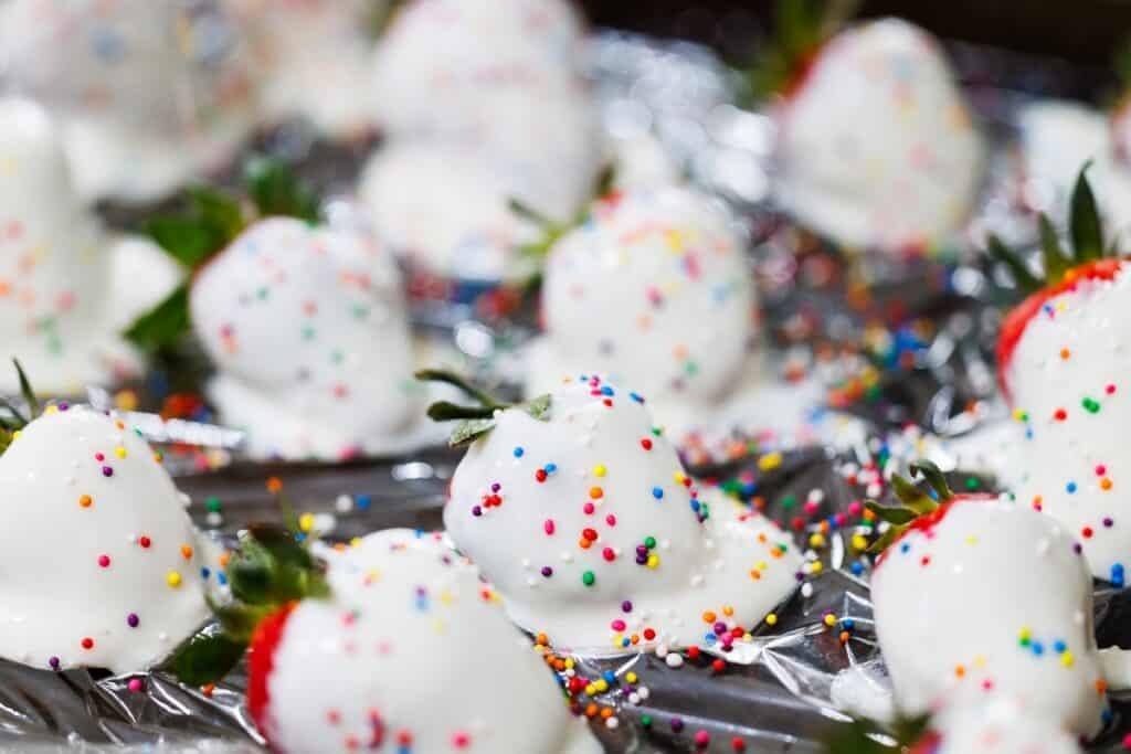 Because of the fairly thin coating on the strawberries, it shouldn’t take more than a couple of hours to harden fully.