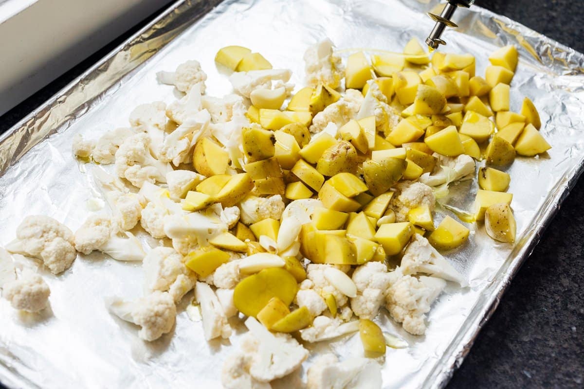 3. Spread oil coated potatoes, cauliflower and garlic in an even layer on baking sheet and roast until golden brown, about 35-45 minutes, stirring once halfway through.