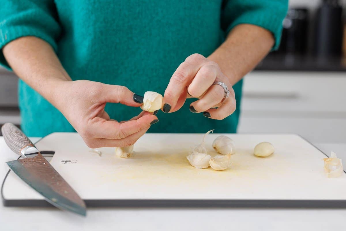 Step 2. Peel your garlic, leaving a single layer of skin on each clove.