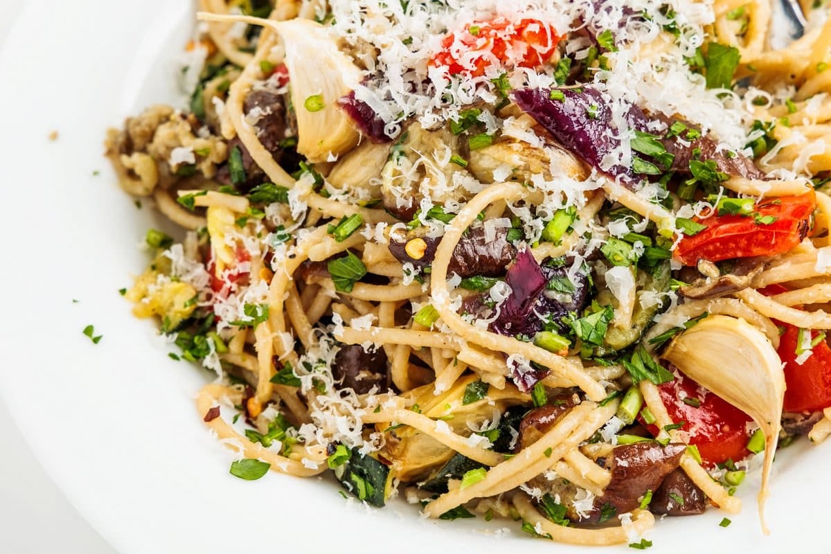A quick and easy meatless main or healthy side dish, your family will love this vegetarian Garlic Roasted Vegetable Pasta.