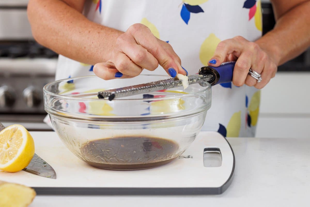 Then use a microplane to grate the garlic and ginger into the bowl.
